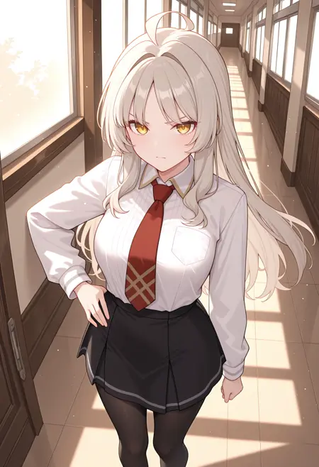 学校制服, 白いシャツ, フォーマルシャツ, 赤いネクタイ, 長袖, 黒いスカート, 黒いタイツ,