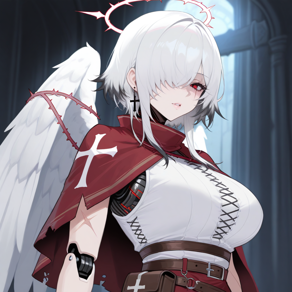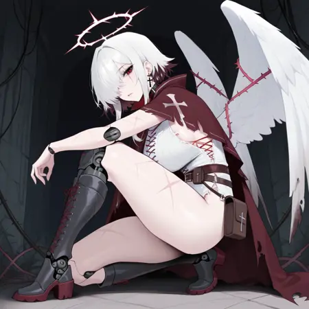 1girl, short hair with long locks, solo, scar across eye, white hair, black gradient tips, linebreaker, red eyes, dark red gradient capelet , cross, android, robot joints, white shirt, cross-laced shirt, angel wings, white thorns, hair over one eye, halo, thorns over body, waist belt, pouch, black cross earring, cross capelet print, sleeveless, scars, torn capelet, cables, torn clothes, cracked skin, white corset, dark red trim, star crown,