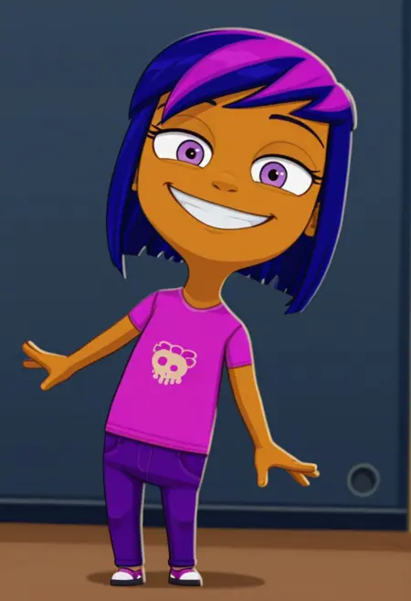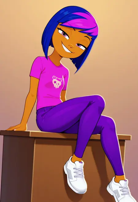 1 girl, solo, multicolored hair, blue hair, short hair, purple eyes, tan skin, pink t-shirt, purple denim jeans, white shoes,