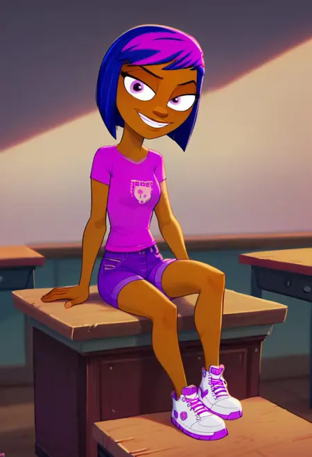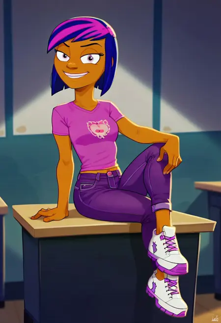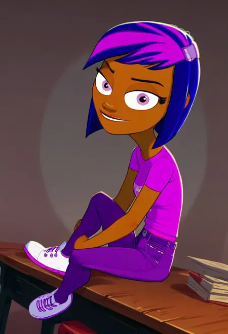 1 girl, solo, multicolored hair, blue hair, short hair, purple eyes, tan skin, pink t-shirt, purple jeans, white shoes,