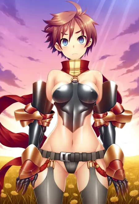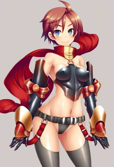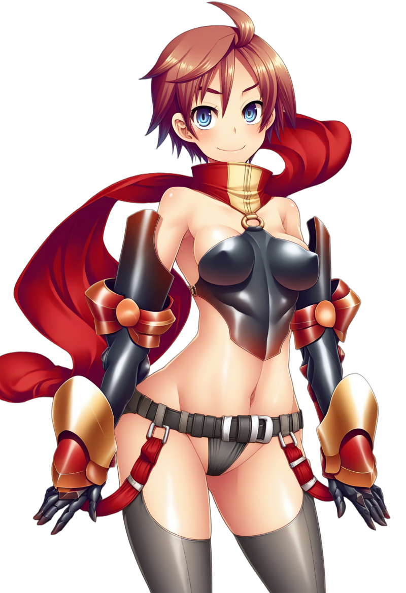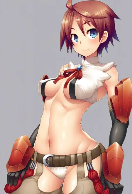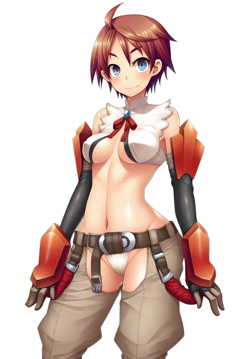 衣装: 外付けのカラー、クロップトップ、青いブローチ、赤いネックリボン、肘まで手袋、茶色のベルト、茶色のズボン、白いパンツ、太ももカットアウト、