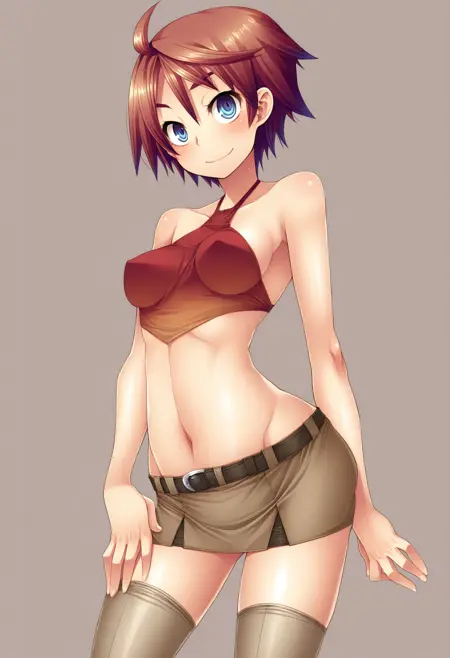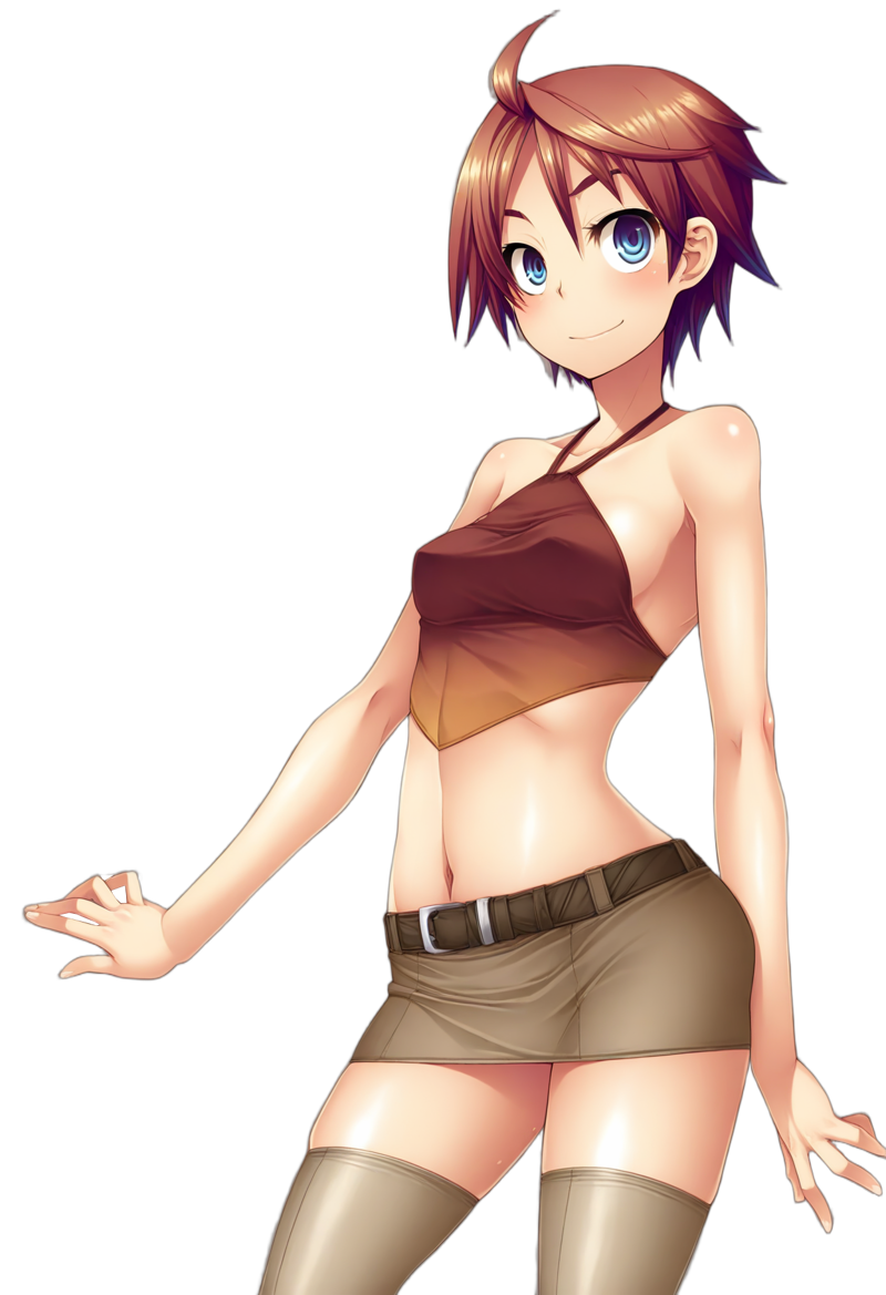 衣装: ハルターネック、茶色のスカート、ミニスカート、茶色のタイツ、へそ、腹出し!