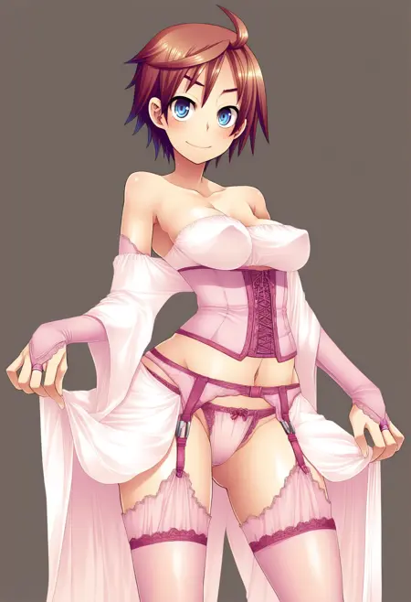 衣装: ランジェリー、ピンクのコルセット、ブライダルガントレット、ピンクのパンツ、ガーター straps、ピンクのタイツ、フリル付きタイツ、白いウエストケープ、
