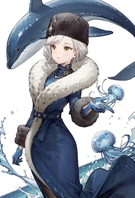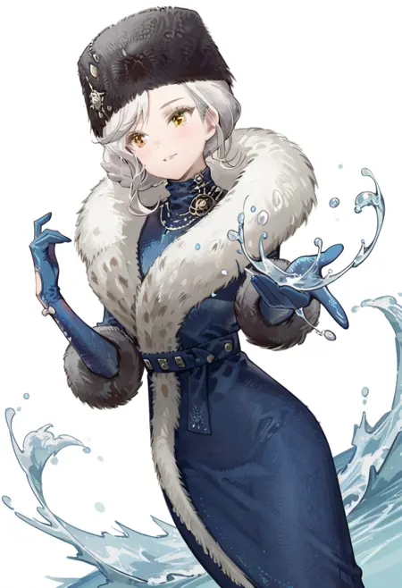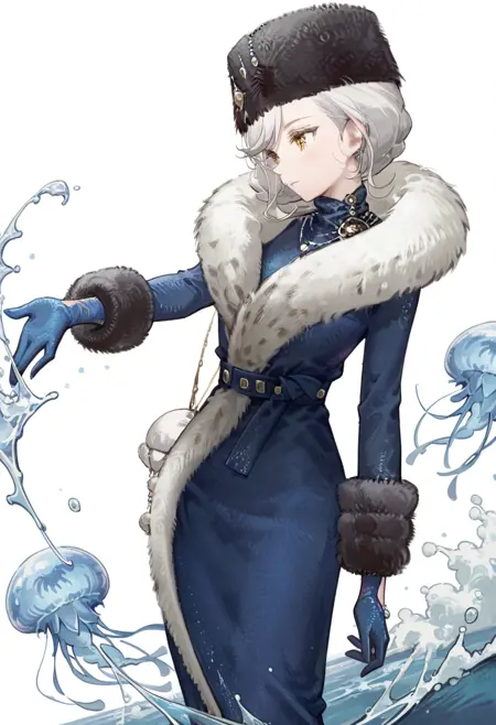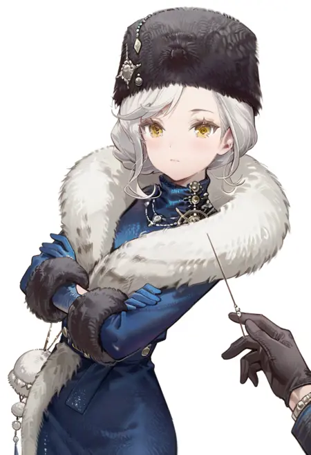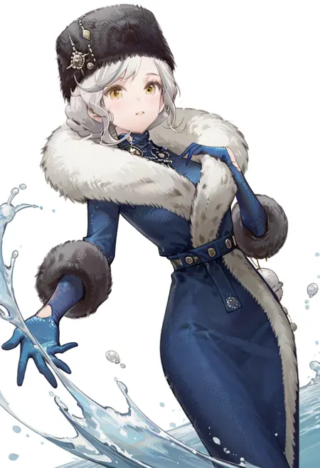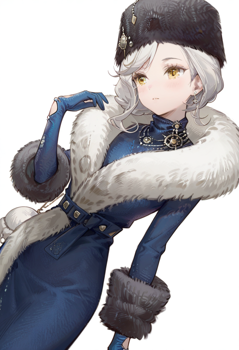 eternity(AVTTA), 노란 눈, 장갑, 흰 머리, POV, 측면에서, 파란 긴 드레스, 장갑, 짧은 머리, 모자, 목걸이,