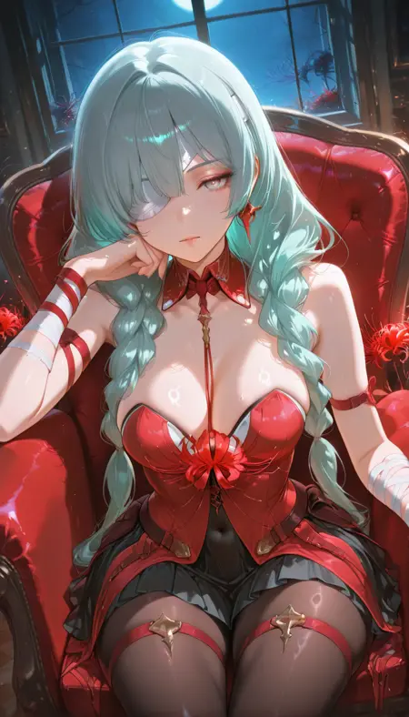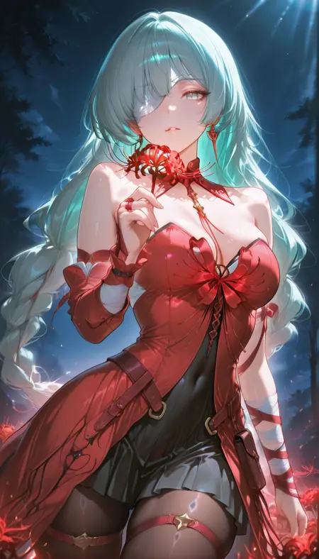 WWPhrolova、ロングヘア、胸、大きい胸、ジュエリー、非常に長い髪、中くらいの胸、緑の目、灰色の髪、編み込み、イヤリング、開いた唇、灰色の目、編み込みツインテール、片方の目に包帯、アイパッチ、多色の髪、低いツインテール、アクア色の髪、目の間の髪、