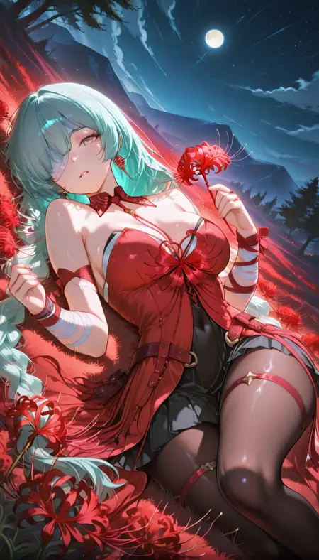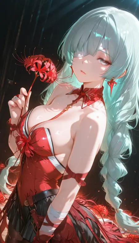 スカート、ドレス、リボン、胸元、ジュエリー、裸の肩、花、太もも、レギンス、プリーツスカート、ベルト、黒いスカート、赤いリボン、黒いレギンス、太ももストラップ、おへそカバー、赤いドレス、赤い花、茶色のレギンス、包帯を巻いた腕、太ももカバー、蜘蛛の百合、ストラップレス、