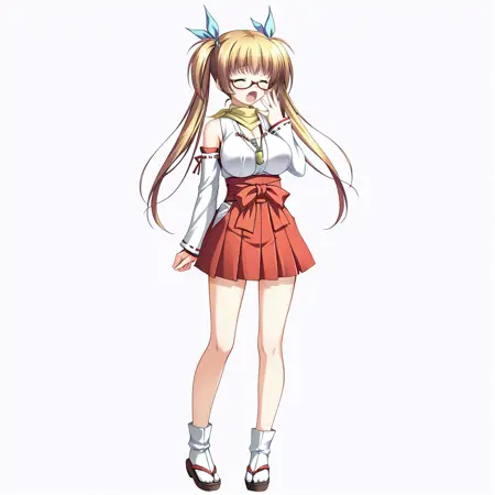 panorama,full_shot,front view,white_background,simple_background,full body,1girl,solo,twintails,breasts,long hair,blue eyes,detached sleeves,blonde hair,necklace,jewelry,ribbon,bare shoulders,hair ribbon,glasses,