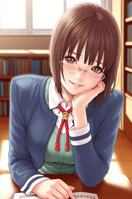 학교 복장은 'myojin school uniform', 'blue blazer', 'pale green vest', 'pale green skirt', 'pendant tie' 태그를 사용하세요.