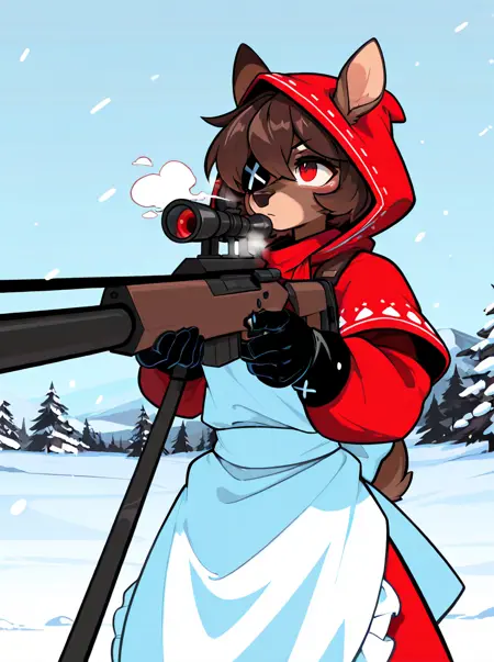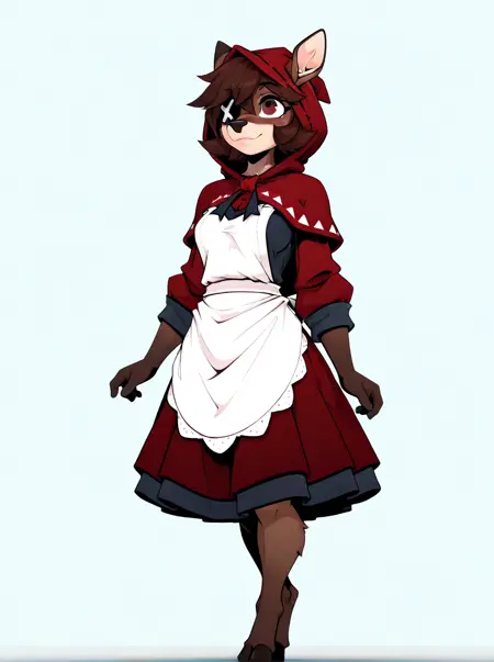 Triggers: anthro, deer, female, eyepatch, red eye, brown hair, short hair, brown body, little red riding hood, apron, white apron, red clothes, hood, hooves, black gloves