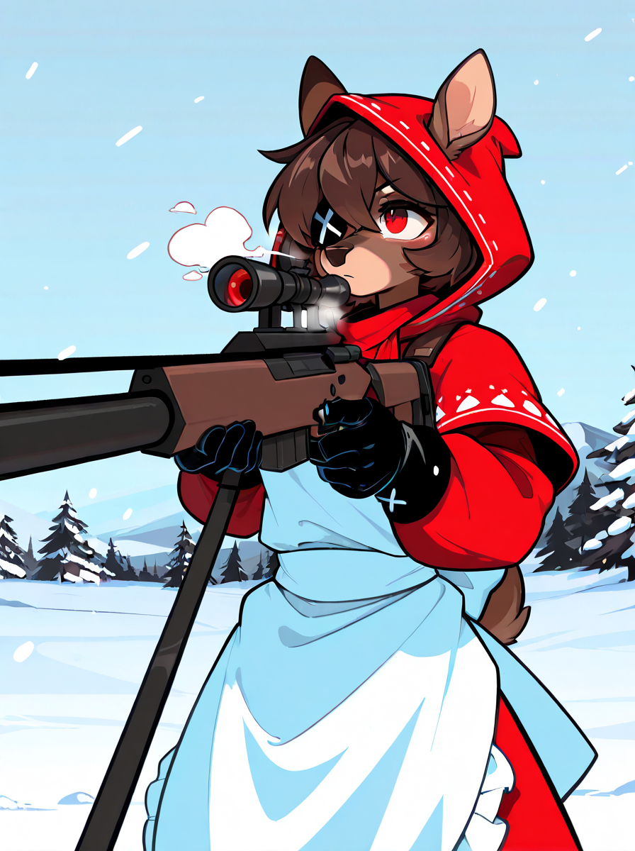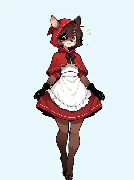 触发词:拟人化、鹿、女性、眼罩、红眼、棕发、短发、棕色身体、小红帽、围裙、白色围裙、红衣、帽子、蹄子、黑色手套