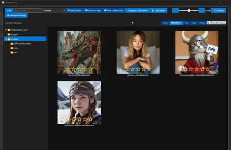 このプログラムには、ステーブル・ディフュージョン向けに特化したいくつかの特別な機能があります。チェックポイントまたはLoraとして分類されたファイルはギャラリービューをサポートしており、プログラムはそのチェックポイントまたはLoraのファイル名を含む最新の画像(および動画!)を検出して、それらをチェックポイントファイルと一緒にギャラリーとして表示します(ファイル名にカスタムキーワードを含めることもサポートされています)。私は、新しいチェックポイントやLoraの評価に非常に役立つと感じています。
