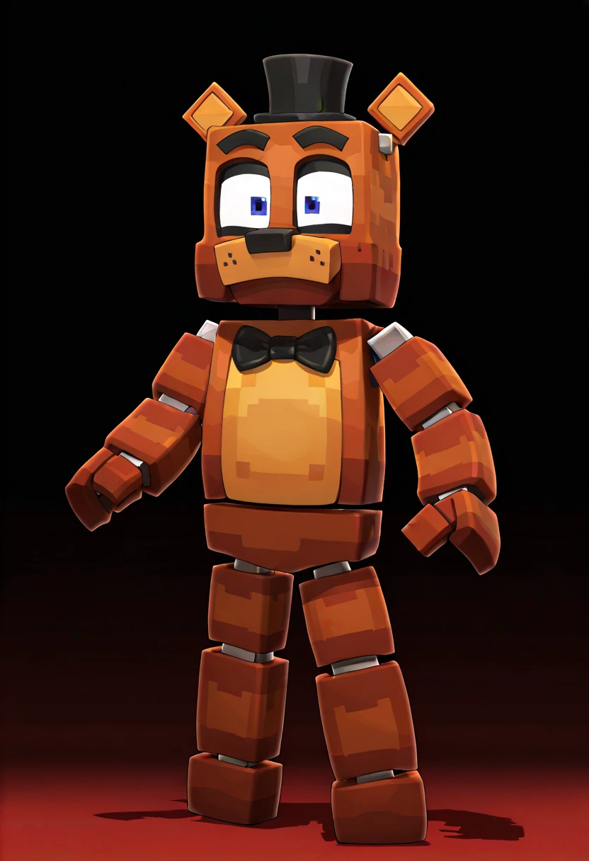 ZaminationFreddyFazbear, 1boy, brown robotic bear, two tone fur, black bowtie, small black top hat, blue eyes, robot joints, square body, square arms,