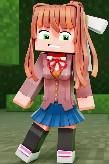 | トレーニングワード | MonikaZamination, 1girl, long orange-brown hair, white head bow, gray-purple blazer, red neck ribbon, brown vest, white shirt, blue skirt, black thigh-high socks, pink-white shoes, green eyes, blunt bags, sidelocks, Monika (doki doki literature club), minecraft (style)コピーしました! |