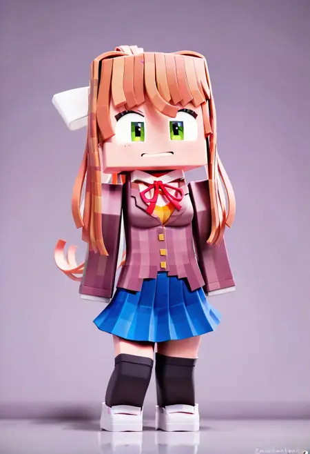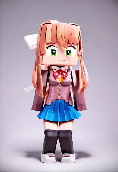 | 训练词汇 | ZaminationMonika, 1girl, purple-brown blazer with gold buttons, red neck ribbon, blue pleated skirt, black knee-high socks, white shoes, cubic aesthetic, brown blocky hair, blunt bags, green eyes, white shirt, sidelocks, long hair, ponytail, ribbon, white ribbon, hair ribbon, square arms, square body已复制! |