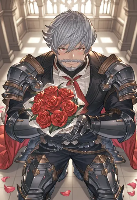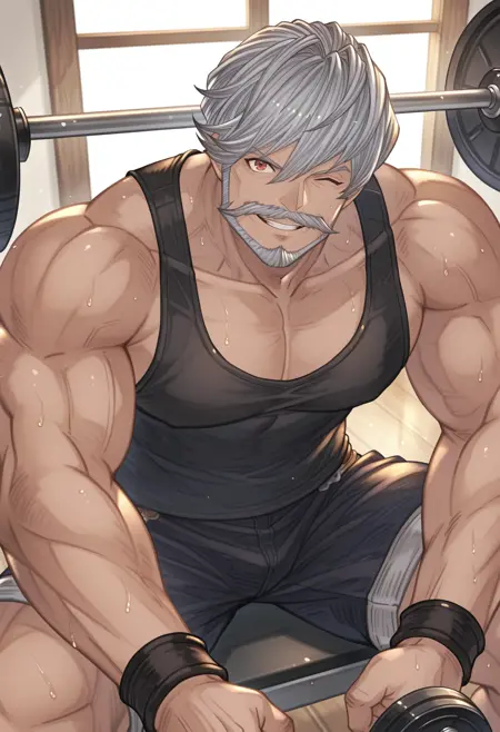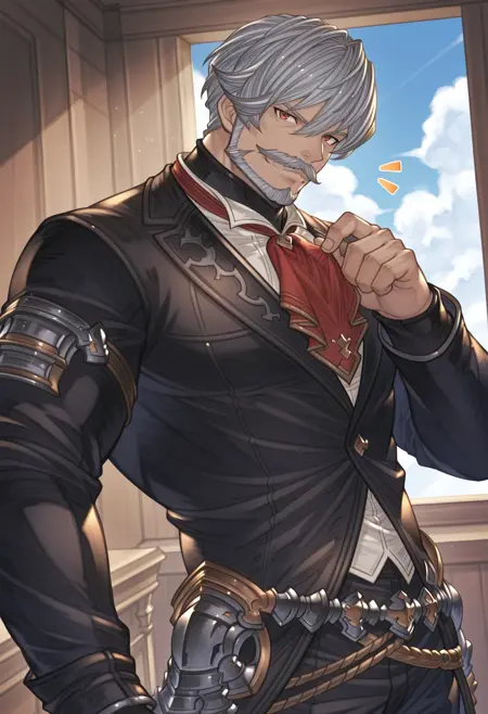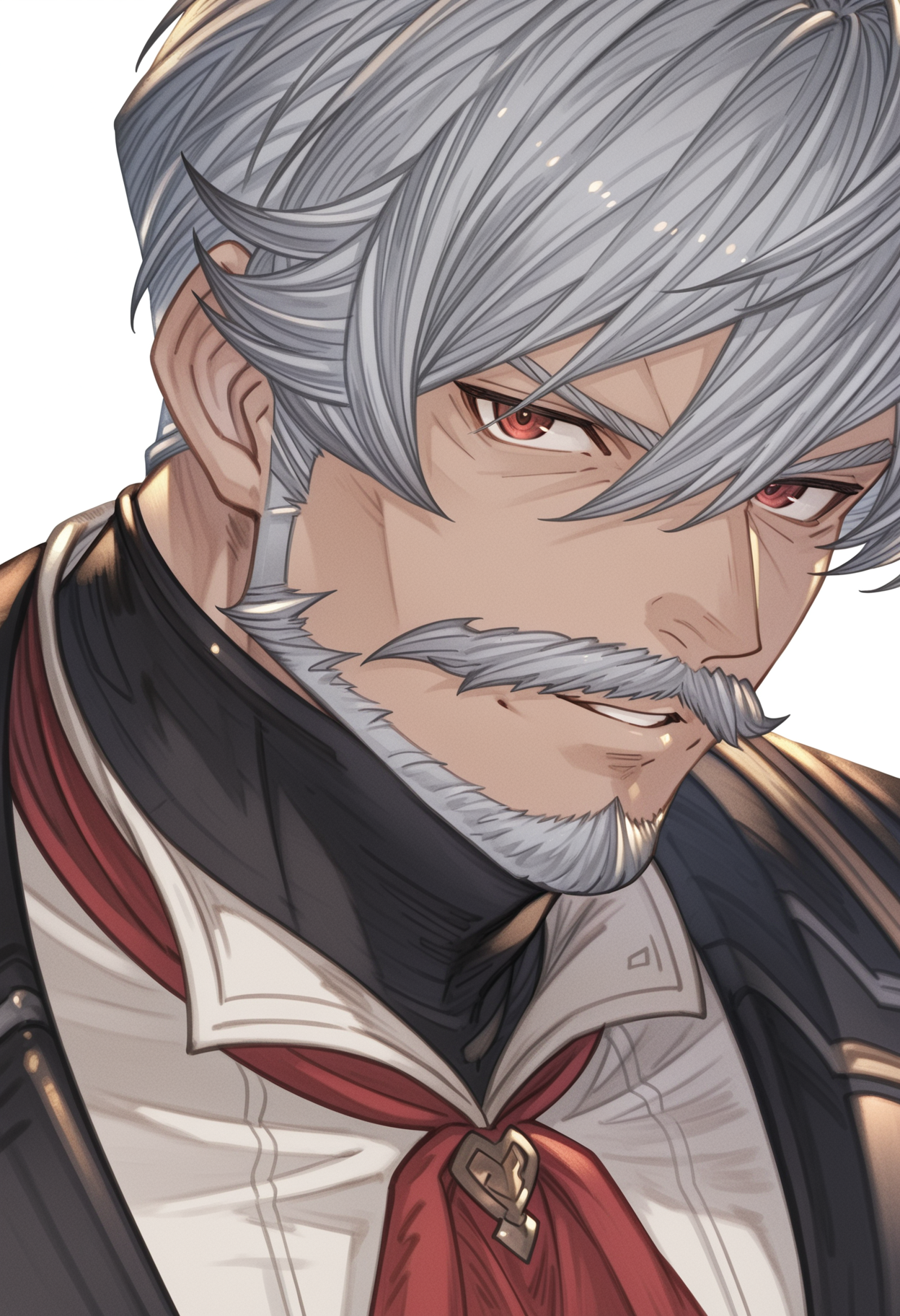 タグ: andrsn_gbf, 灰色の髪, 赤い目, 顔の毛, ひげ, ひげの須,