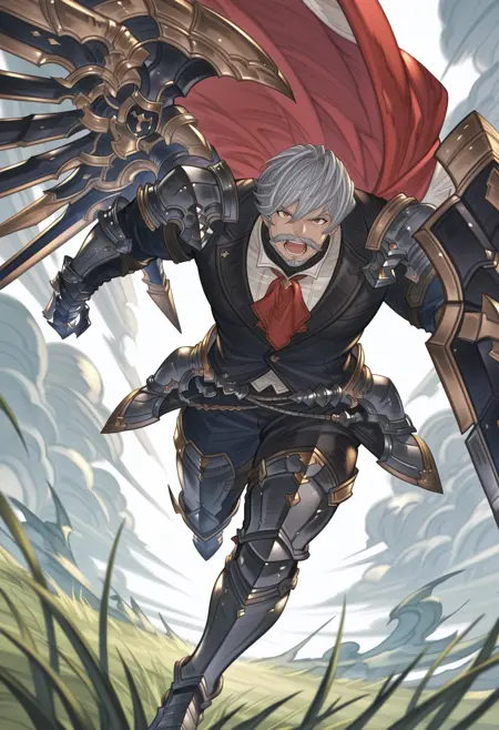 - 衣装プロンプト(必要に応じて使用): 白いシャツ、黒いタートルネックシャツ、赤いアスコット、黒いジャケット、ベルト、黒いズボン、肩のアーマー、ガントレット、腰のアーマー、膝のアーマー、アーマードブーツ、メカニカルウィング