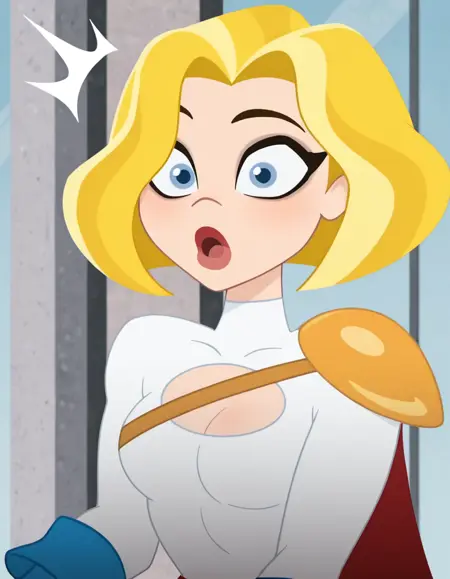 - dcshgpowergirl、金髪、ボブカット、リップスティック、青い目、白いレオタード、胸元の切り替え、ゴールドのパウルドロン、胸ストラップ、ショルダーケープ、赤いベルト、青い手袋、青いブーツ