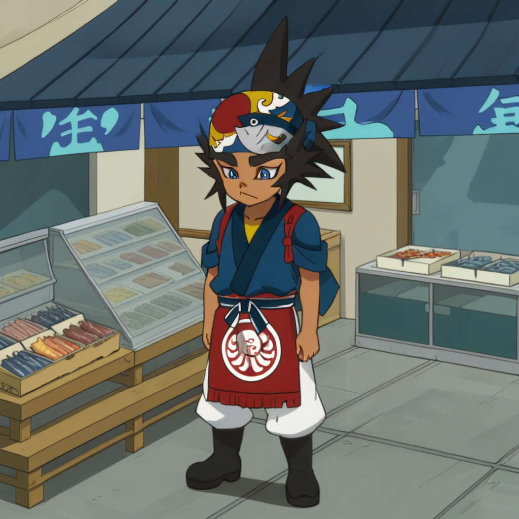 プロンプト: 男性、暗い肌、黒髪、とがった髪、バンダナ、青い目、濃い眉毛、日本の衣装、黄色い下着、たすき、腰布、白いズボン、ブーツ/素足、屋内(市場/店/魚/天井)、屋外(空/雲/海/道)、屋外(プール/水なし/青空/フェンス/茂み)、太陽の光線背景/日の丸/波/山、縞模様背景/花びら