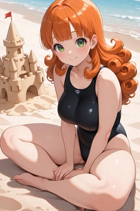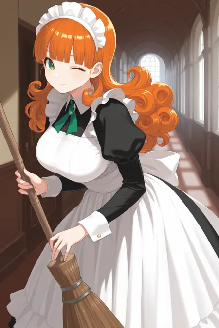 트리거 단어는 "prcslr"이며, "주황색 머리카락, 긴 머리, 곱슬머리, 단정한 앞머리, 녹색 눈"이 필수입니다.
