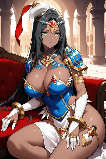• 为她的第二阶段觉醒造型添加:“2ascscz, 深色皮肤女性, 黑发, 分开的刘海, 非常长的头发, 绿色眼睛, 面部纹饰, 皇冠, 额饰, 红色丝带, 白色帽子, 肩甲, 蓝色铠甲, 蓝色紧身衣, 暴露胸部, 手臂缠绕, 新娘手套, 手环, 手镯, 骨盆帘”。