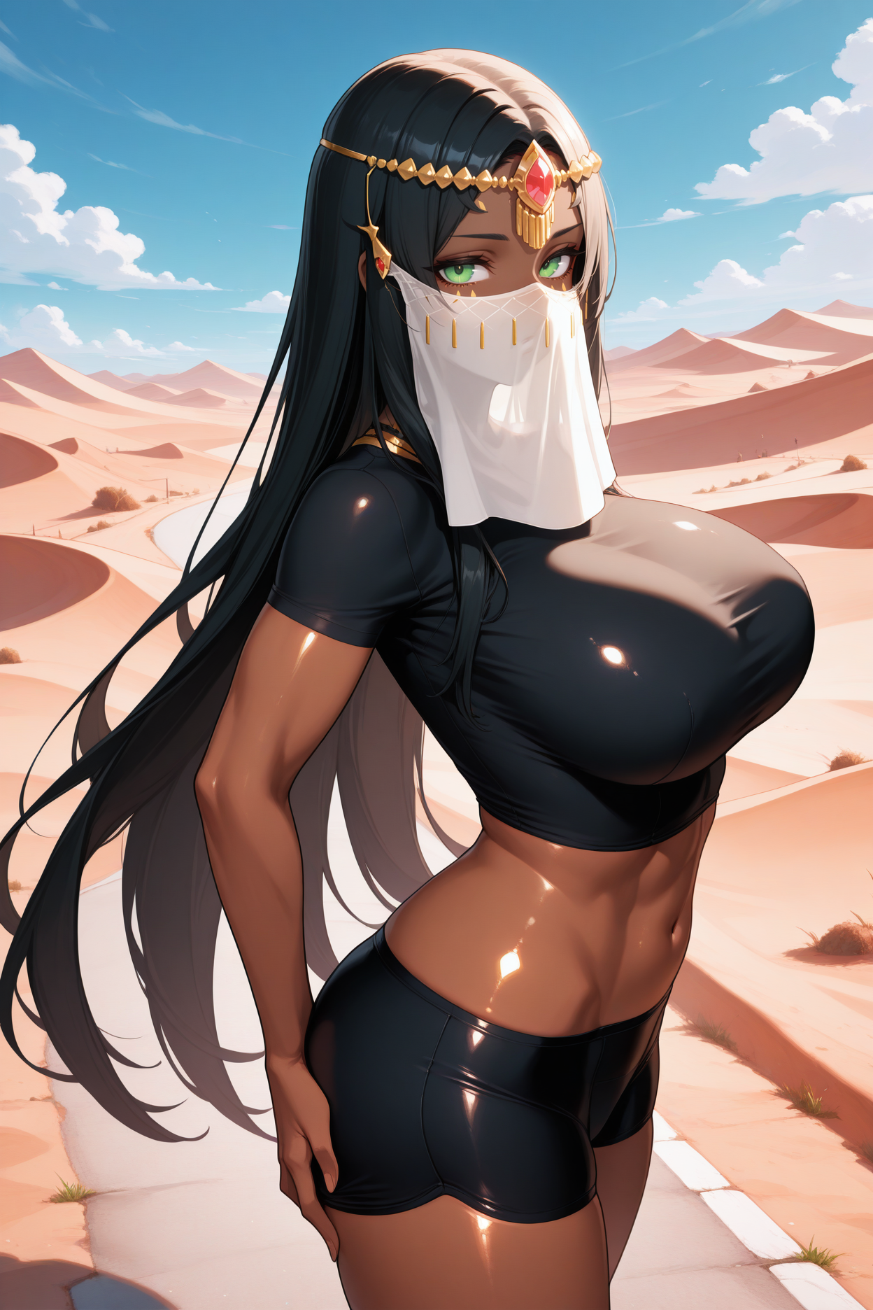 • 为她的第三阶段觉醒造型添加:“3ascscz, 深色皮肤女性, 黑发, 分开的刘海, 非常长的头发, 绿色眼睛, 面部纹饰, 皇冠, 额饰, 白色帽子, 羽饰, 比基尼铠甲, 侧乳, 金色胸针, 黑色比基尼, 黑色铠甲, 黑色肩甲, 露腹, 手环, 手臂缠绕, 新娘手套, 手镯, 腹链, 大腿饰带”。