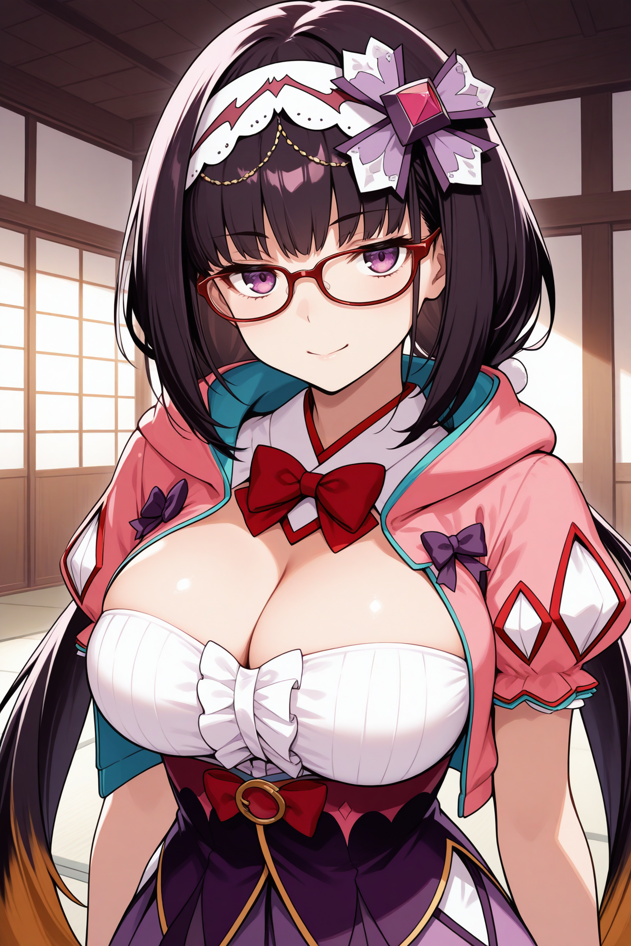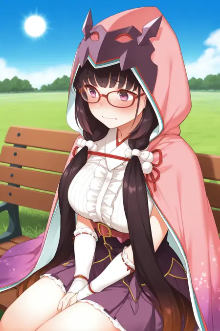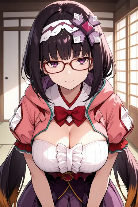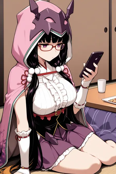 • 大阪姫(2段階覚醒)には「2aohme、黒髪、非常に長い髪、低めのツインテール、紫の目、眼鏡、赤枠のメガネ、フード付きマント、ピンクのマント、フードを下ろした状態、ヘアバンド、髪飾り、紫のリボン、白いシャツ、ノースリーブ、中央のフリル、アンダーバスト、紫のスカート、アームウォーマー」を追加してください。