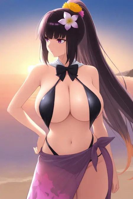 • 大阪姫(アーチャー)(3段階覚醒)には「ハイポニーテール、黒髪、非常に長い髪、紫の目、髪の花、スリング型ビキニトップ、黒いネクタイ、黒い水着、サラング」を追加してください。この衣装はデータの質が悪いため不整合です。