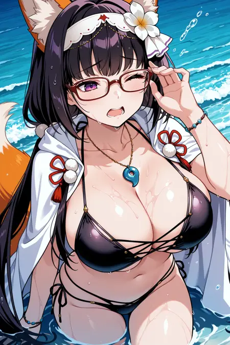 • 「Foxy Lady」衣装には「fldohme、黒髪、非常に長い髪、低めのツインテール、紫の目、キツネの耳、髪のボブ、眼鏡、赤枠のメガネ、白いヘアバンド、髪の花、白い花、満月形のネックレス、鎖骨、白いカーディガン、ストリングビキニ、黒いビキニ、クロスレースビキニ、サイドタイのビキニパンツ、ブレスレット、キツネの尻尾」を追加してください。