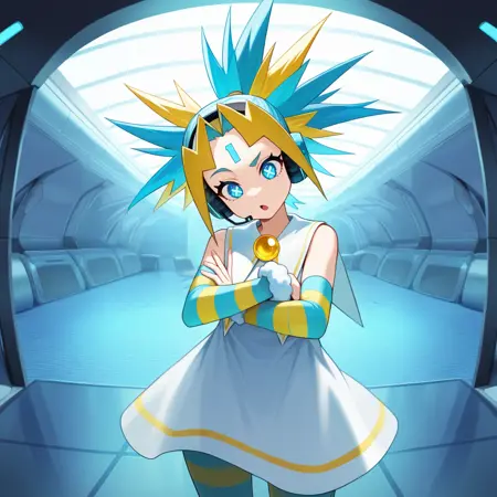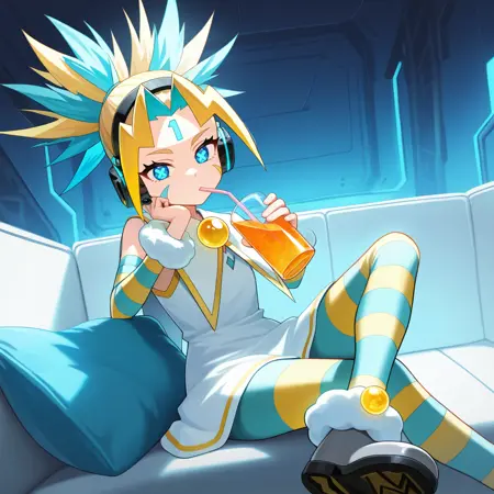 IchigoXBey,尖刺头发,多彩头发,蓝色头发,金色头发,蓝色眼睛,条纹服装,耳机,额头标记,数字纹身,水手服,白色连衣裙,黄色镶边,耳机,黄色宝石,无袖连衣裙,白色水手领,可拆卸袖子,毛皮袖口,毛皮腕带,毛皮踝带,面部标记,条纹袖子,条纹裤子,裤子,符号形瞳孔,X形瞳孔,灰色鞋履,鞋子,