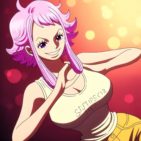 GinnyOP, 1소녀, 싱글, 분홍색 머리, 어수선한 머리, 사이드락, 앞머리, 보라색 눈, 주근깨, 입술, 큰 가슴, 가슴 사이, 두꺼운 허벅지, 연한 노란색 민소매 셔츠, 노란색-갈색 핫팬츠,