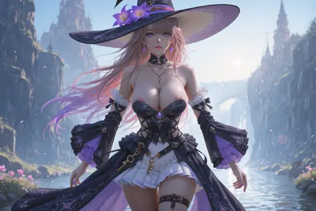 HertaBlender,1girl,witch hat,hat,solo,long hair,detached sleeves,earrings,boots,witch,jewelry,purple eyes,dress,black footwear,purple flower,hat flower,knee boots,thigh strap,gradient hair,virtual youtuber,necklace,earring,skirt,very long hair,tachi-e,frills,multicolored hair,grey hair,black dress,frilled sleeves