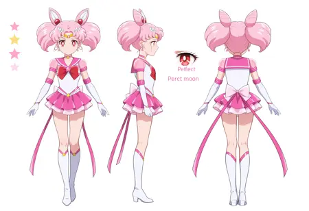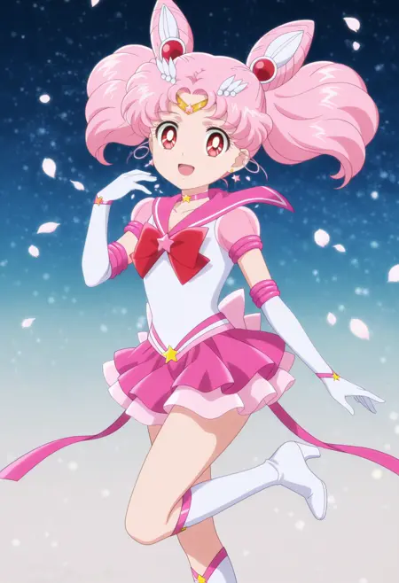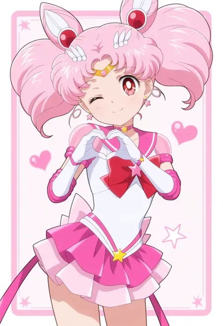 ヘアバン、ピンクの髪、ピンクのセーラー領、セーラー戦士のユニフォーム、ツインテール、ジュエリー、 bow、チョーカー、魔法少女、イヤリング、髪飾り、赤い目、短い髪、手袋、星(シンボル)、ピンクのブローチ、スカート、背中側の bow、ティアラ、サーキュレット、膝上ブーツ,