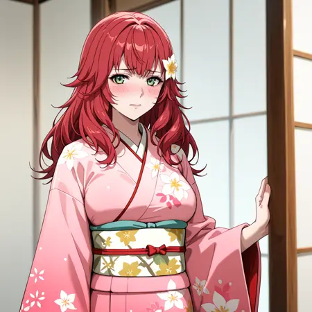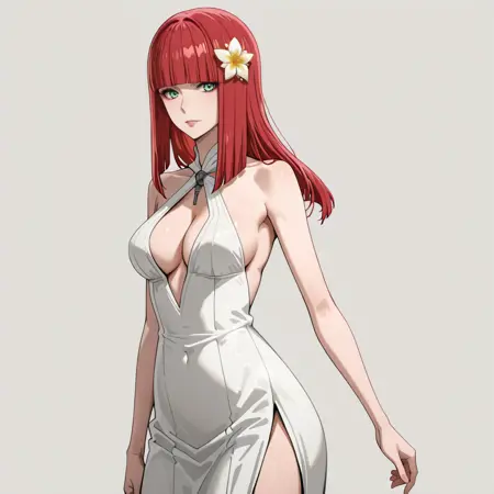 포폴라 트리거: Popola, 1girl, 빨간 머리, 머리 장식, 드레스, 긴 머리, 머리 꽃, 녹색 눈, 벨트, 앞머리, 카우보이 샷