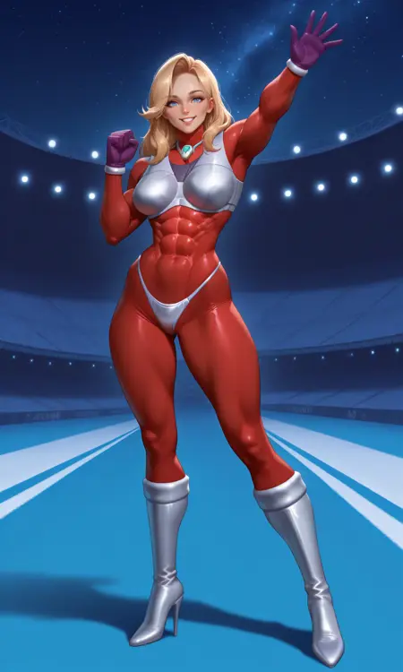 [Default Outfit]: blonde hair, long hair, covered abs, blue eyes, red bodysuit, silver breastplate, impossible armor, silver panties, purple gloves, silver high heel boots, necklace, gem