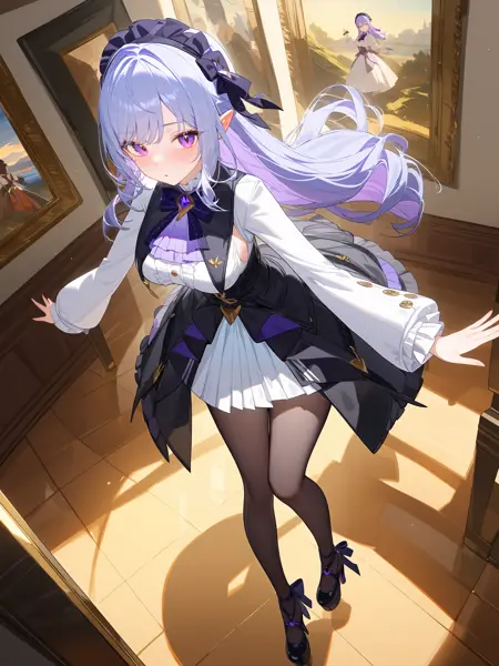 她的默认游戏内女仆装额外提示词:荷叶边发带、领饰、白色短开衫、领结、白色无袖衬衫、层叠裙摆、印花连裤袜、厚底高跟鞋