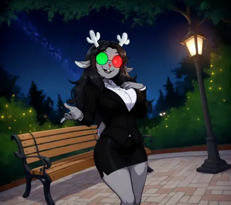 검은 머리, 긴 머리, 어지럽게 흐른 머리, 회색 피부, 이빨 드러남, 이종 색안경, 둥근 안경, 안경, 검은 프레임 안경, 틴트된 안경, 불투명한 안경