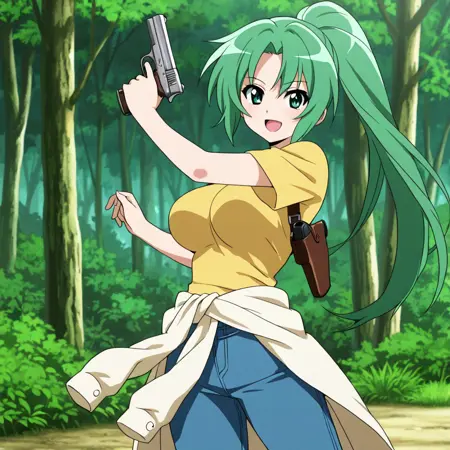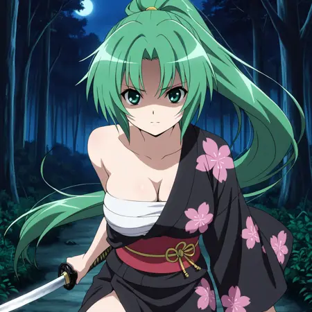 Sonozaki Mion (higurashi no naku koro ni),green hair,ponytail,green eyes,large breast
