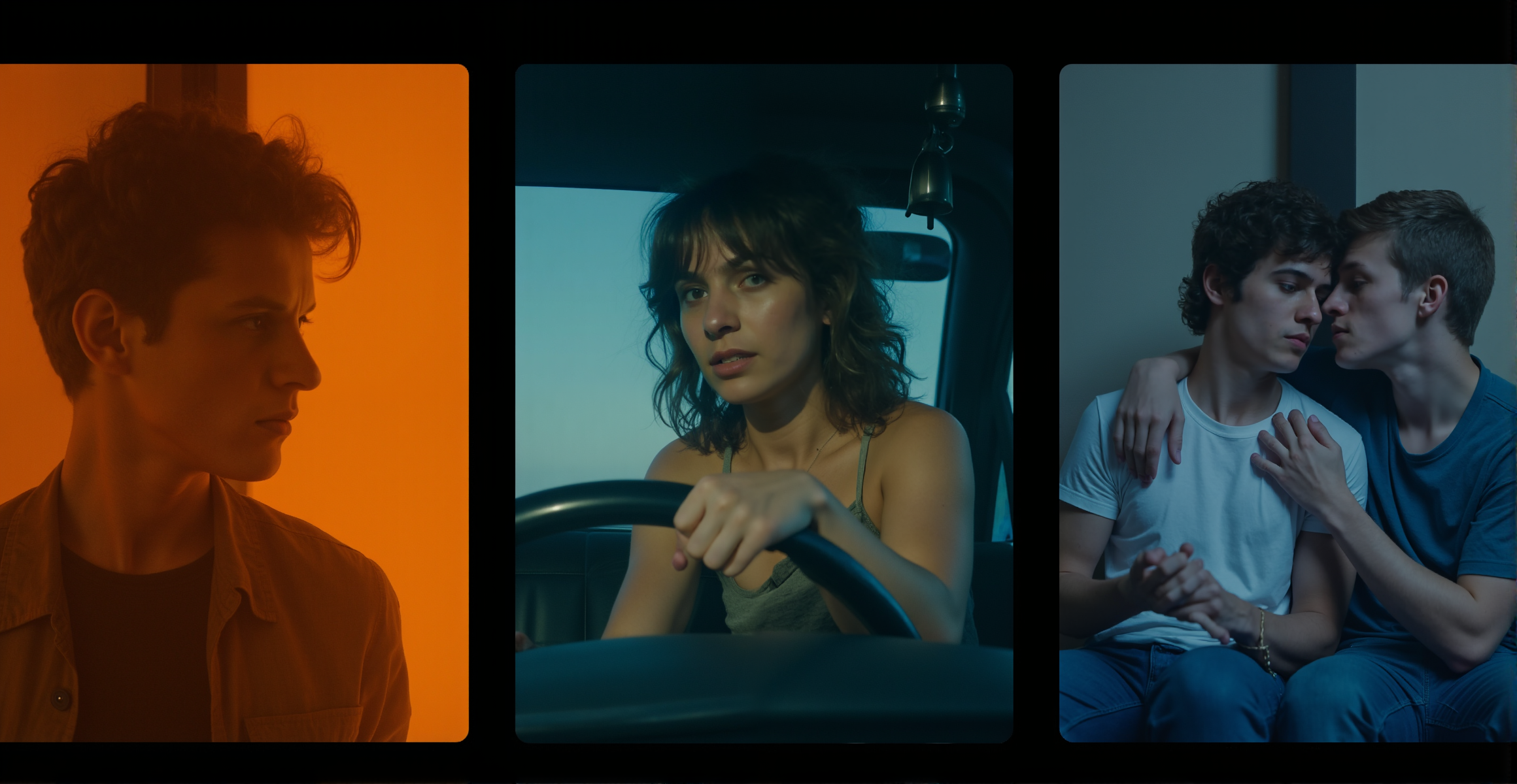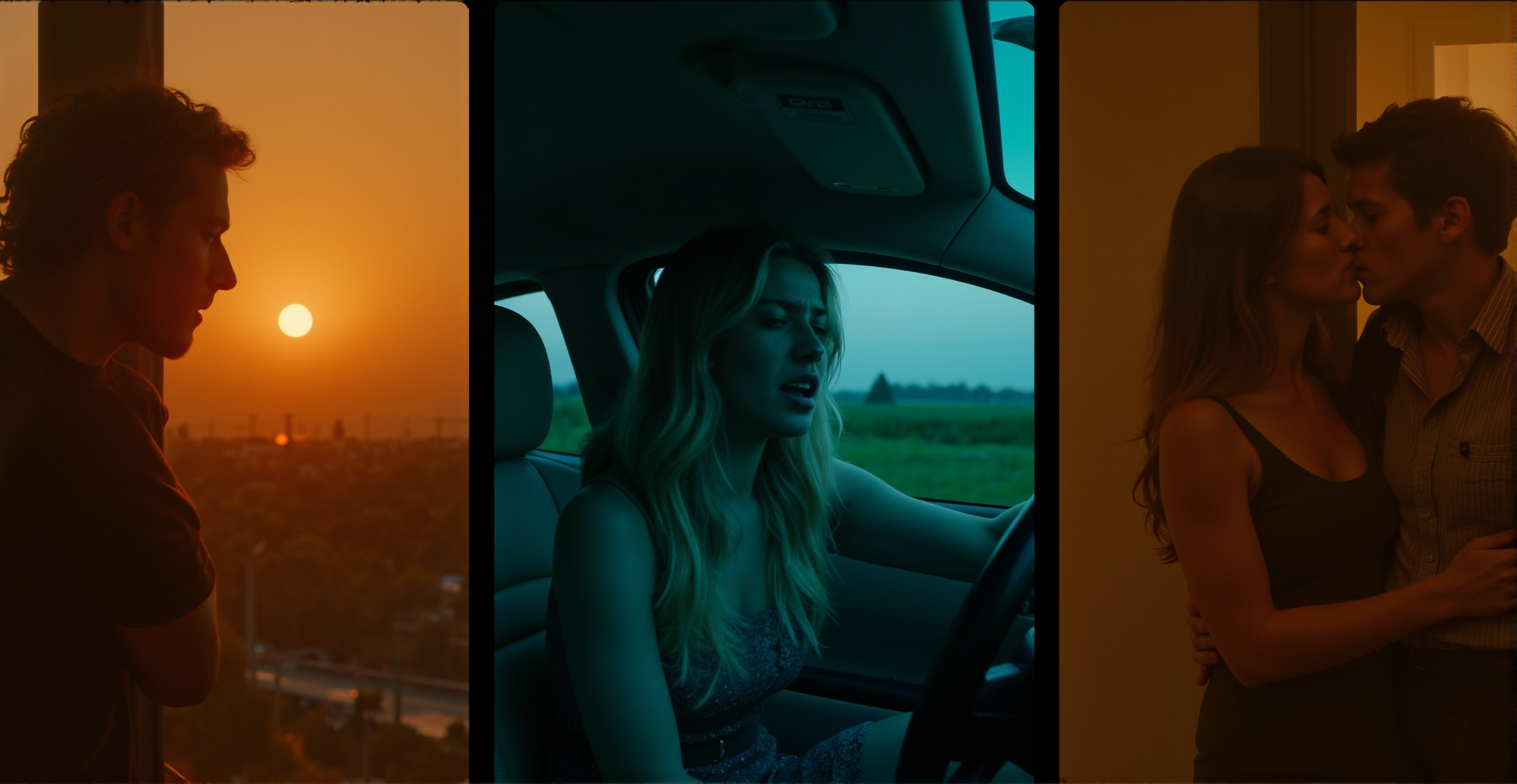 synsplit, triptych, split-frame composition. Left panel: a lonely man with tousled hair staring pensively out of a window during golden sunset, soft rim light casting shadows across his face, wearing a wrinkled white shirt. Center panel: a woman gripping the steering wheel tightly inside a dimly lit car, tears streaming down her face, illuminated by dashboard glow and distant city lights. Right panel: two young lovers standing close in a narrow hallway, one whispering into the other’s ear with a conflicted expression, ambient blue lighting casting intimate shadows on the wall behind them.