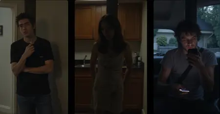 synsplit, triptych, split-frame composition, three friends in conflict. Left panel: a young man smoking outside. Center panel: a woman pacing in a dark kitchen. Right panel: a guy sitting alone in a car, looking at his phone