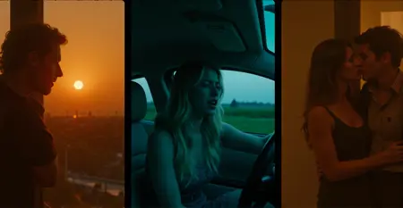 synsplit, triptych, split-frame composition. Left panel: a lonely man with tousled hair staring pensively out of a window during golden sunset, soft rim light casting shadows across his face, wearing a wrinkled white shirt. Center panel: a woman gripping the steering wheel tightly inside a dimly lit car, tears streaming down her face, illuminated by dashboard glow and distant city lights. Right panel: two young lovers standing close in a narrow hallway, one whispering into the otherβs ear with a conflicted expression, ambient blue lighting casting intimate shadows on the wall behind them.