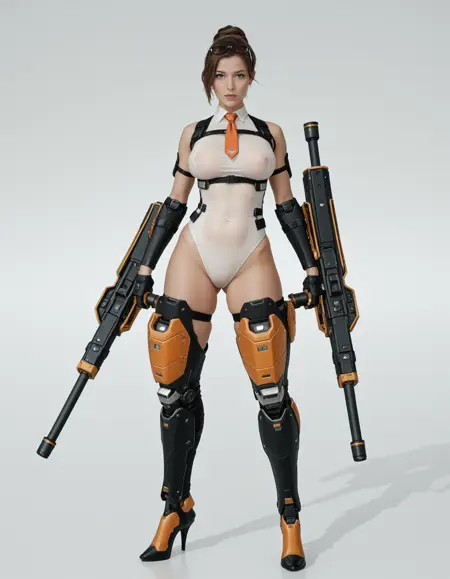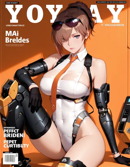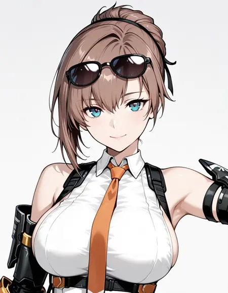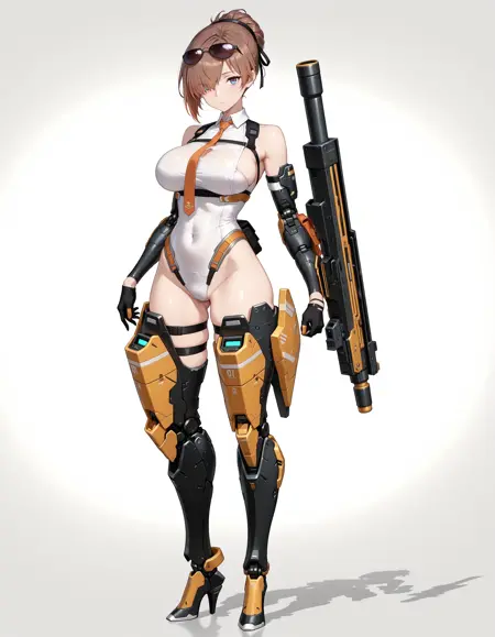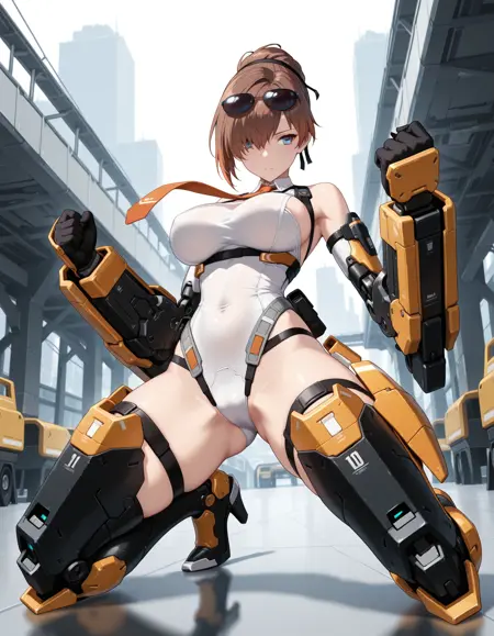 mai_pgr_bridget_yy,1girl,solo,blue_eyes,brown_hair,short_hair,ponytail,hair_over_one_eye,sunglasses,eyewear_on_head,large_breasts,white_leotard,bare_shoulders,orange_necktie,gloves,leotard,thighhighs,thigh_boots,high_heels,science_fiction,mecha_musume,mechanical_parts,mechanical_arms,mechanical_legs