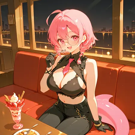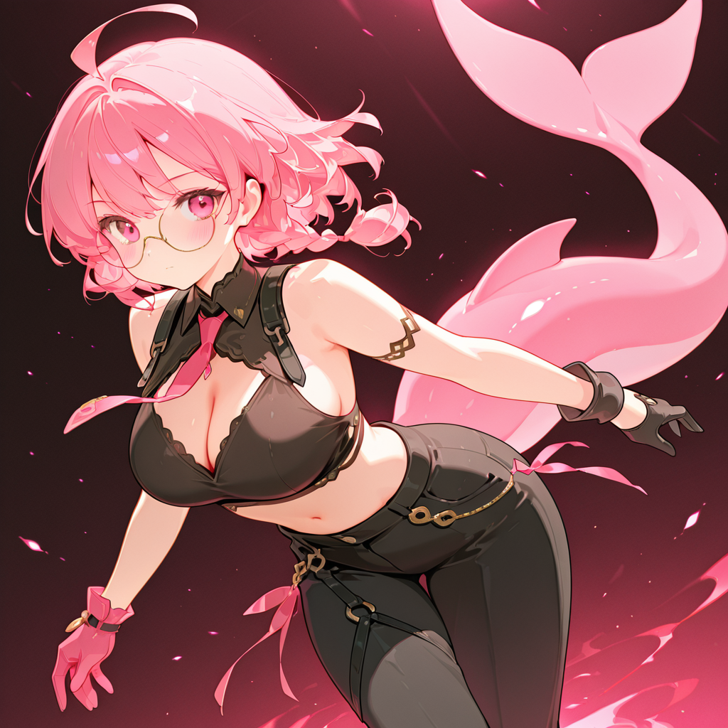 codej, 1girl, solo, 단발, 큰 가슴, 셔츠, 장갑, 배꼽, 가슴선, 어깨 노출, 보석, 닫힌 입, 꼬리, 분홍색 머리, 땋은 머리, ahoge, 넥타이, 안경, 소매 없음, 허리 노출, 바지, 분홍색 눈, 크롭 상의, 검은 크롭 상의, 소매 없는 셔츠, 단일 땋은 머리, 검은 바지, 단일 장갑, 둥근 안경, 반장갑, 돌고래 꼬리,