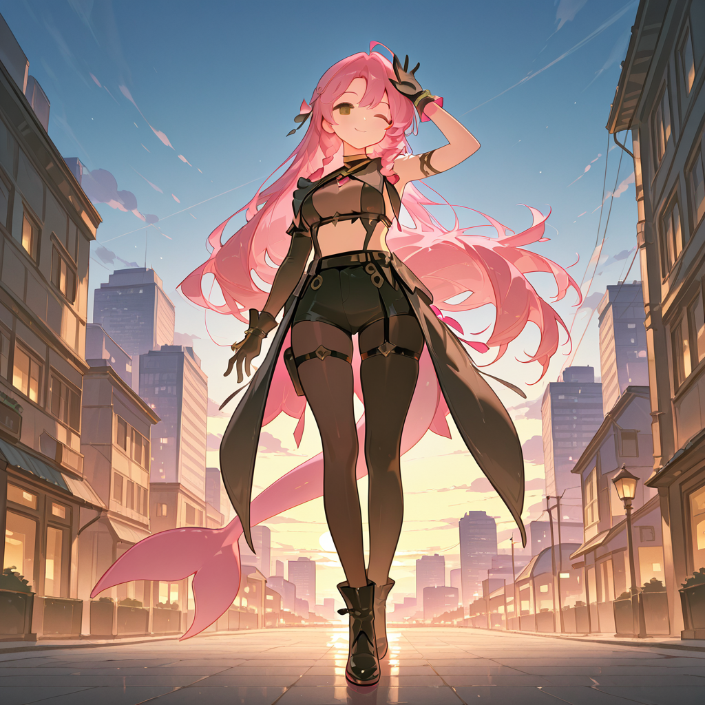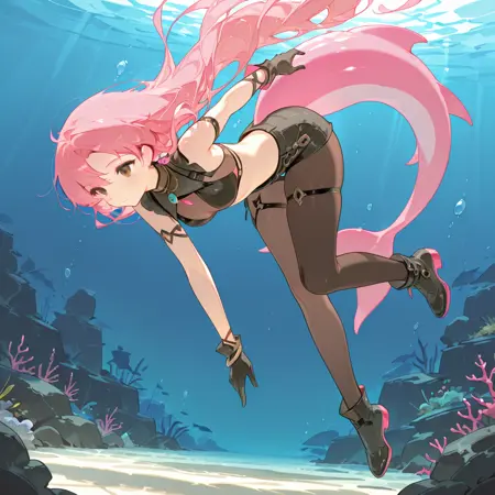 codej, 1girl, solo, 긴 머리, 땋은 머리, 머리장식, 장갑, 갈색 눈, 보석, 매우 긴 머리, 꼬리, 전체 신체, 분홍색 머리, 반바지, 검은 장갑, 검은 신발, 허벅지 스트랩, 단일 장갑, 한쪽 다리 스타킹, 돌고래 꼬리,