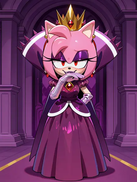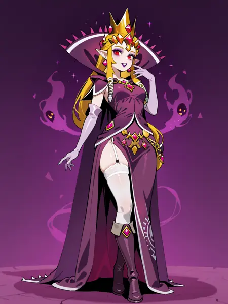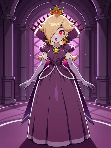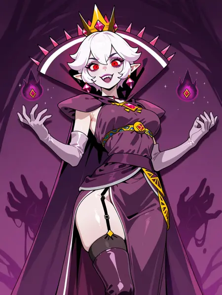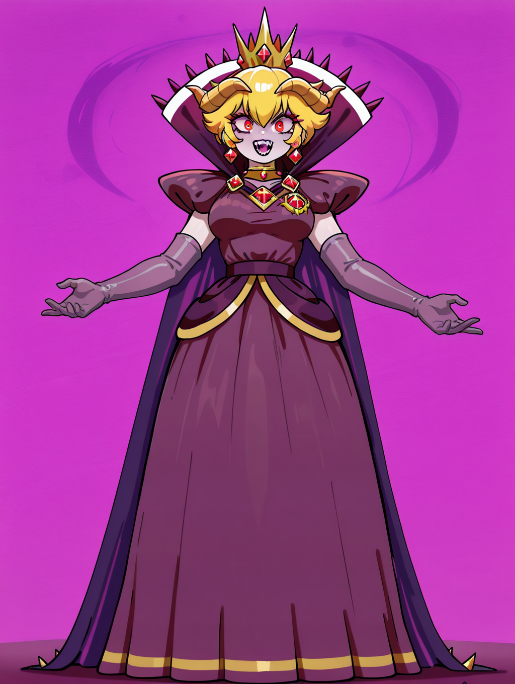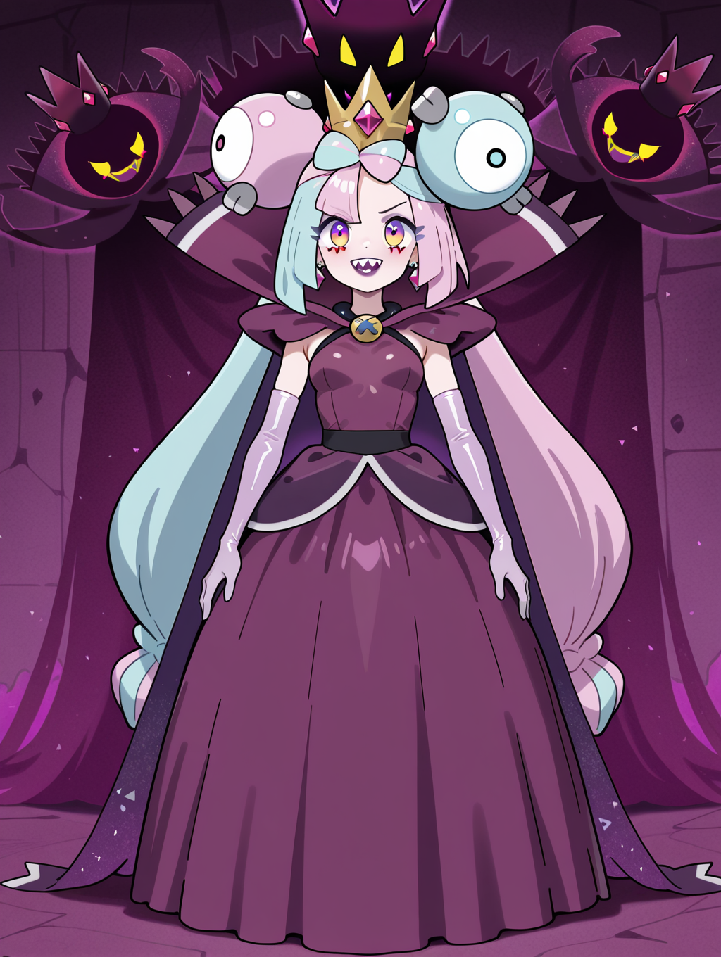 shadow queen possession, elbow gloves, purple dress, cape, crown, makeup, red eyes, jewelry, earrings,