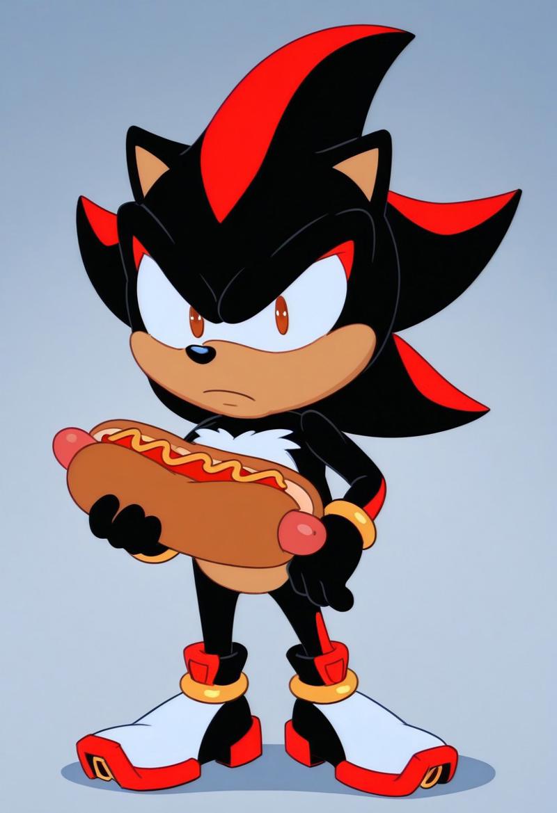 best quality, masterpiece, solo, cartoon, male, 1boy, shadow the hedgehog, (chibi:0.3), full body, looking at viewer, hotdog, annoyed