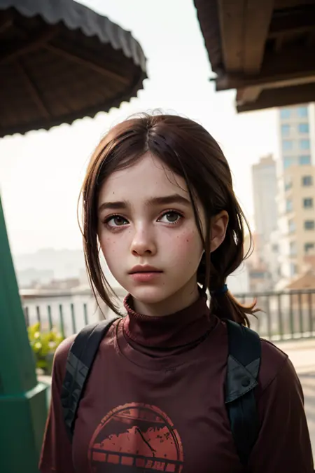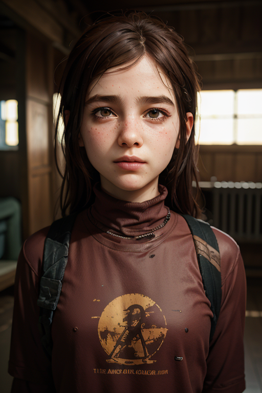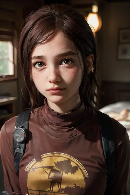 prompt: A stunning and intricate full color Ultra-HD portrait, a 13 year old girl, short brown hair, green eyes, detailed face, turtleneck dress or brown t-shirt, with 2 pale yellow palm tree logo, in a room with a window. no plants, epic character composition, alessio albi, nina masic, sharp focus, natural lighting. , subsurface dispersion, f2, 35mm,