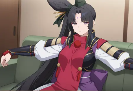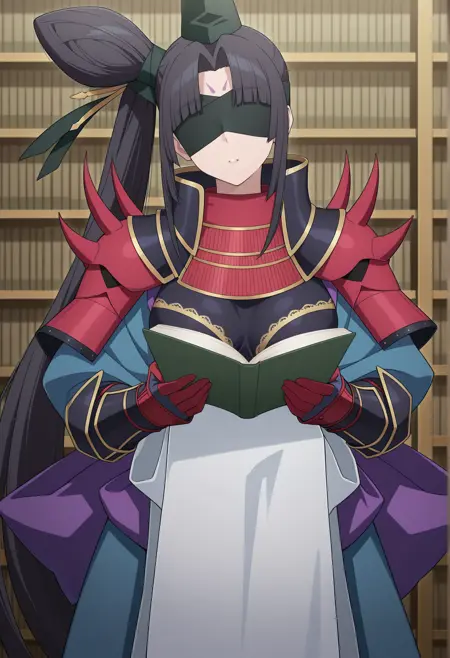 昇進2: 非常に長い髪、黒髪、片側のポニーテール、コーン型の結い上げ髪、尖った帽子、複色の目、額の模様、和服、日本甲冑、全身鎧、リボン、パウルドロン、帯、サッシュ、目隠し