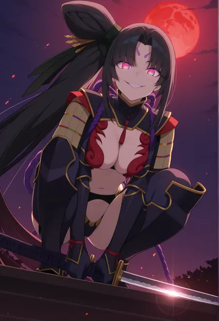 昇進3: 非常に長い髪、黒髪、片侧のポニーテール、コーン型の結い上げ髪、髪飾り、複色の目、額の模様、露出度の高い衣装、外れた襟、ビキニアーマー、和服、ロープ、ガーターベルト、ガーター紐、鎧付きブーツ、