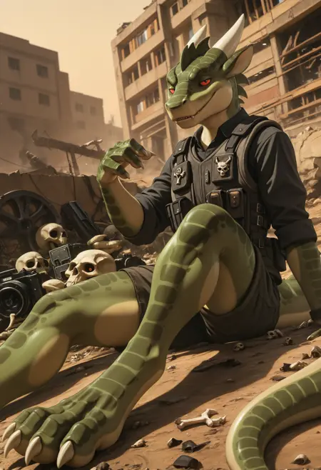 sp1tey_l1zardlars, scalie, tail, furry, furry male, male focus, green skin, 1boy, solo, horns, colored skin, claws, red eyes, teeth, looking at viewer