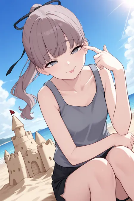 外見:vcl、灰色の目、茶色の髪、ストレートの前髪、長い髪、ポニーテール、髪飾り、黒いリボン